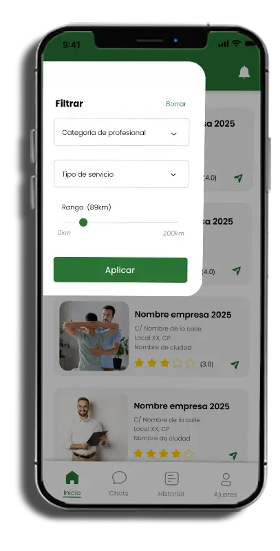 Solo tienes que filtrar por la categoría del servicio que buscas y tu ubicación. En segundos verás perfiles de profesionales cercanos con sus valoraciones.